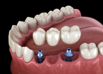 Just two implants can replace several teeth in a row. A bridge can be used to fill the gap with a crown on each end supported by an implant post. It is also possible to support a partial denture with implants; the number of posts needed depends on how many teeth are missing and where they’re located.